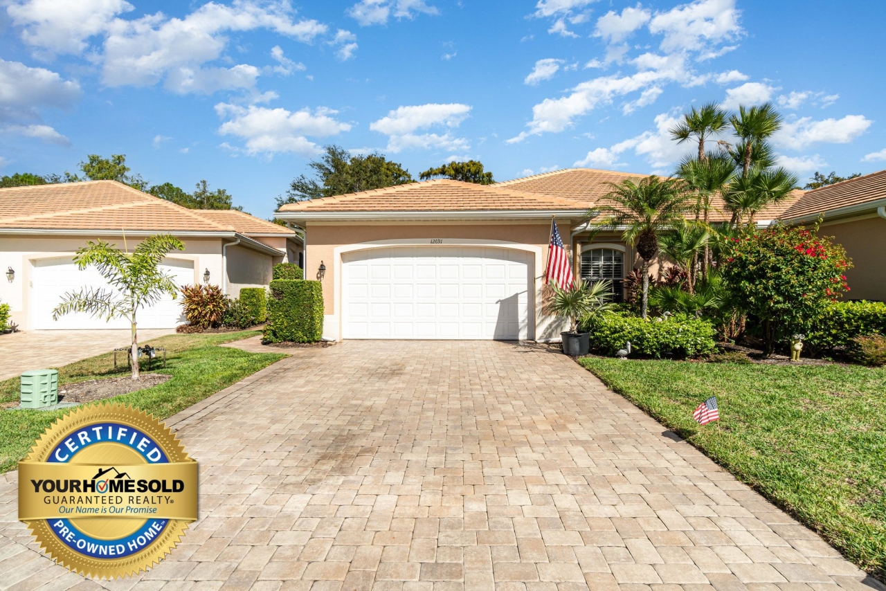 Experience exceptional value, lifestyle, and peace of mind in this beautifully updated two-bedroom plus den residence located in the prestigious, gated Hunters Ridge Golf and Country Club in Bonita Springs. This home is offered as a Certified Pre-Owned Home, providing unmatched security and transparency for today's buyer. Your purchase includes a full professional pre-inspection, a comprehensive one-year home warranty, generous buyer incentives, and the exclusive Love It or Leave It Guarantee-which means that if you do not love this home after 12 months, we will sell it for free or buy it back. Combined with up to $5,000 in closing cost credits and interest rates as low as 4.00% for qualified buyers, this home delivers exceptional confidence, affordability, and value. Inside, the home features a bright and spacious open layout ideal for everyday living and entertaining. The kitchen offers abundant countertop seating, an eat-in breakfast area, and seamless flow into the expansive family room. Sliding glass doors extend the living space outdoors to an oversized, extended lanai overlooking a tranquil preserve-perfect for relaxing, dining, or hosting gatherings year-round. A versatile flex space adjacent to the kitchen serves perfectly as a home office, den, or formal dining room. The split bedroom layout enhances privacy, with the primary suite positioned separately from guest accommodations. The primary bedroom is filled with natural light, offers direct access to the lanai, and features plantation shutters. The en-suite bath includes dual vanities, a soaking tub, and a separate walk-in shower. The guest bedroom is equally comfortable, offering ample space and sunshine. Recent updates include fresh interior paint, a new air-conditioning system, a new water heater, and brand-new bedroom carpet-ensuring the next owner enjoys a move-in-ready home with modern efficiency and comfort. The current owner holds a social membership, and golf memberships are optional, giving buyers flexibility to tailor their lifestyle. Community amenities include championship golf, lighted tennis and pickleball courts, bocce, croquet, a resort-style swimming pool with lap lanes, a poolside bar and restaurant, a welcoming clubhouse, and a state-of-the-art fitness center with a full-time instructor. Conveniently located just 20 minutes from RSW Airport, the beaches, Naples, the Mercato, and the soon-to-open Bonita Midtown Plaza-a vibrant new dining, retail, entertainment, and residential destination only a short bike ride away. This Certified Pre-Owned Home offers quality, transparency, protection, and lifestyle advantages rarely found in today's market. Schedule your private showing today and experience the difference for yourself.